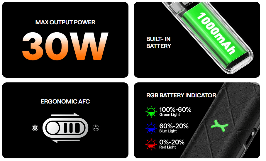 توفر سحبة اكسلم جو من اوكسفا أقصى اخراج من 5-30 واط، وهو نظام بود مثالي لأولئك الذين يتنقلون أو يسافرون، حيث يكتشف تلقائيًا مقاومة الكويل ويستخدم القوة الكهربائية المناسبة.